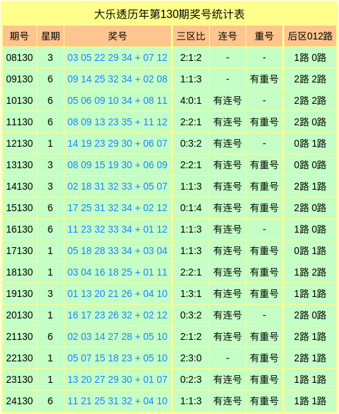 历年同期大乐透奖号数据统计表