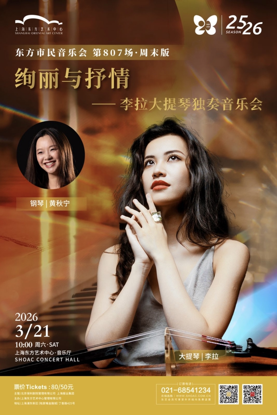 3月两场演出各具特色,上海拉纤人室内合唱团献演“望春风”专场,呈现《如愿》《身骑白马》等改编精品。3月21日,颇具人气的青年大提琴家李拉将携手钢琴家黄秋宁,演绎“绚丽与抒情——李拉大提琴独奏音乐会”,普罗科菲耶夫《C大调大提琴奏鸣曲》、肖斯塔科维奇《D小调大提琴奏鸣曲》等颇具难度挑战的大提琴作品将依次上演。4月18日,迎来俄罗斯竖琴名家路易莎·明茨耶娃与匈牙利长笛演奏家盖尔盖伊·伊采什的“仙女梦幻曲”二重奏,奏响德彪西《月光》《梦幻曲》、皮亚佐拉《探戈的历史》组曲等。